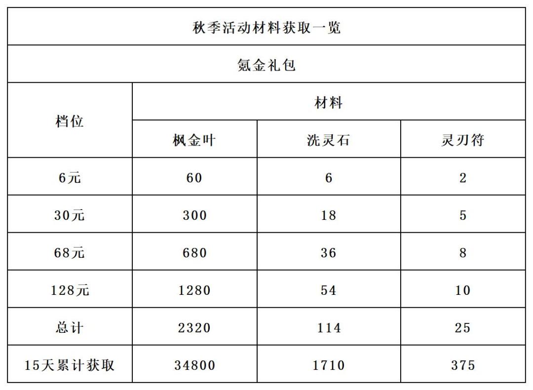 说实话这个礼包给的奖励一般,枫金叶正常全勤获取的话材料是足够换两个金首饰的,灵刃符也足够用,唯一亮点就是洗灵石,洗灵石如果能更多一些就好了。