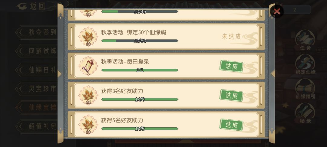 另外填写和收到仙缘码还会有任务奖励,达到一定次数可以获得枫金叶。