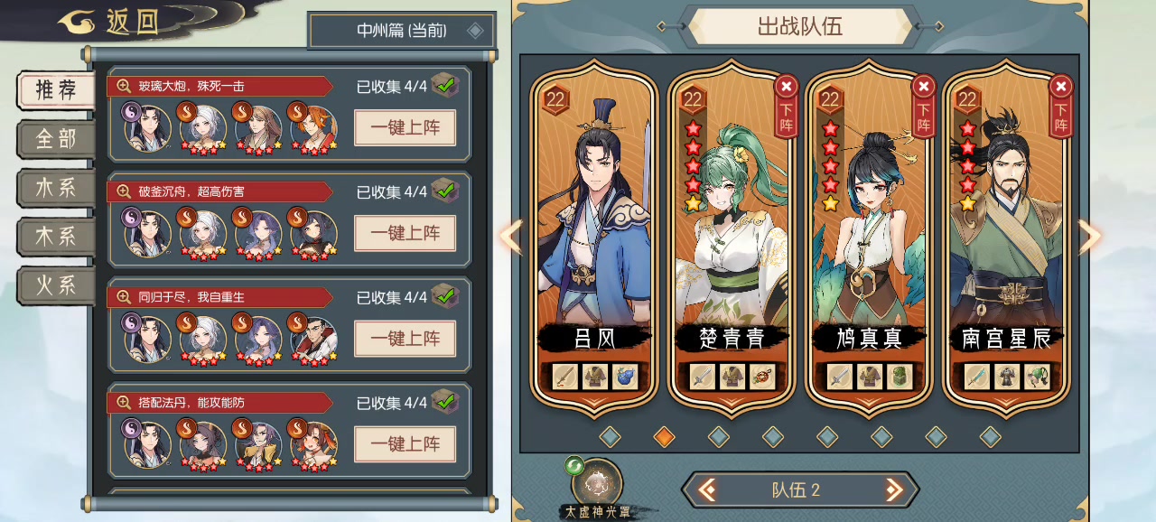 第一回合:楚青青打出玄天幽藤符和玄藤符,鸠真真打出青雾咒和聚藤决,南宫星辰打出藤甲符、巨藤盾决和木盾术,木盾术尽量在木灵气下打出,鸠真真打出追风咒,吕风复制追风咒并全部打出,楚青青打出归一决。吕风也可以携带阵法卡太虚神光罩来抵挡一部分伤害。