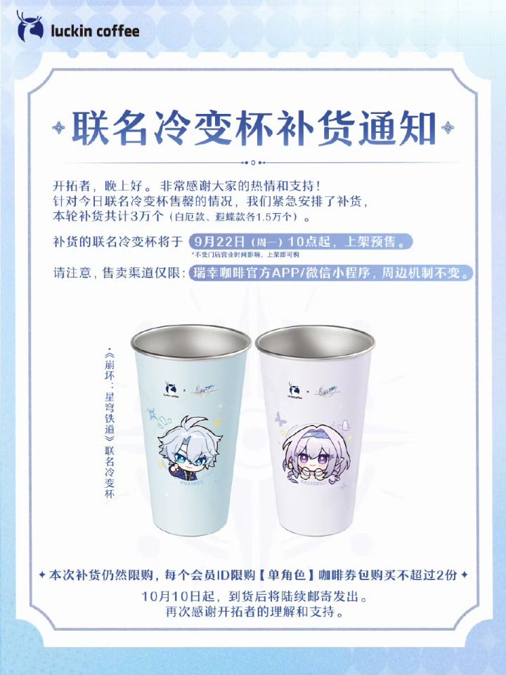 由于大家对瑞幸×星穹铁道联名活动的热情高涨,联名冷变杯迅速售罄。为感谢大家支持,瑞幸紧急安排补货!此次补货数量为3万个 ,白厄款和遐蝶款各1.5万个。