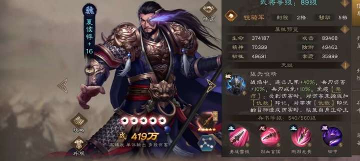 5级效果:造成两段75%近战兵刃伤害,若敌人移动力低于夏侯惇,则在攻击前施加【仇敌】