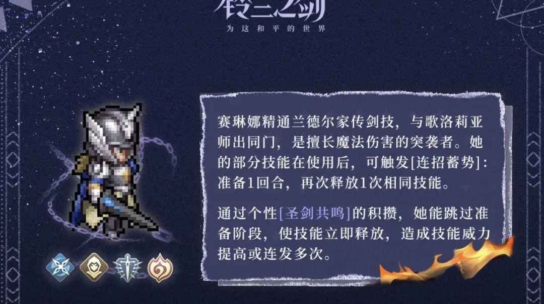 赛琳娜师从兰德尔骑士,曾是骑士团备受瞩目的新星,却因反对裁决王卡姆洛特而被迫远走异乡。