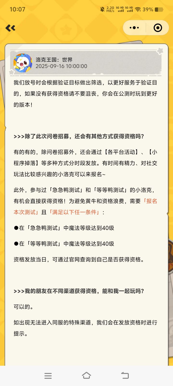 如此前参与过「急急鸭测试」和「等等鸭测试」的小洛克,必定资格!需要「报名本次测试」且在「急急鸭测试」或「等等鸭测试」中魔法等级达到40级。这个资格是额外的,不占用本次测试资格