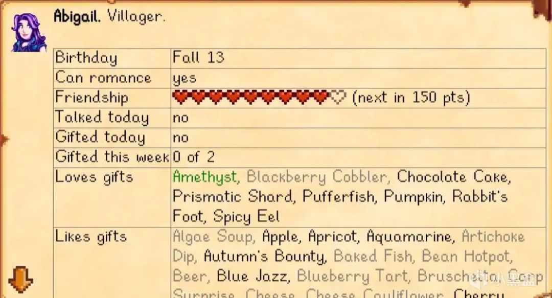 绝对好用的真神mod。只需要把鼠标放到任意东西上之后按F1,就可以看到相关具体信息,比方说可以看居民的好感度,生日,喜好的礼物,小桶酿造完毕时间,作物成熟时间等等。对方喜欢喜欢的物品如果自己身上有还会标绿。做混合栽培成就等等也会告诉你还要出货多少个,极大减小了萌新的入门门槛。