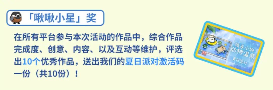 共设有两个奖项:「啾啾小星」奖在所有平台参与本次活动的作品中,综合作品完成度、创意、内容、以及互动等维护,评选出10个优秀作品,送出我们的夏日派对激活码一份(共10份)!
