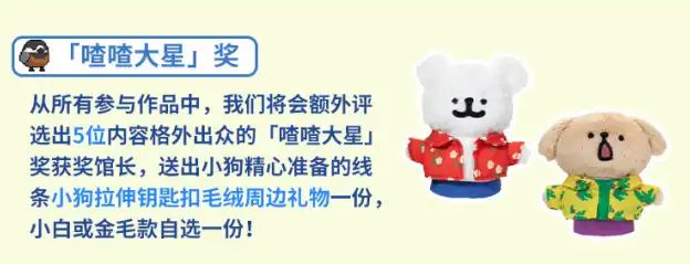 「喳喳大星」奖从所有参与作品中,我们将会额外评选出5位内容格外出众的「喳喳大星」奖获奖馆长,送出小狗精心准备的线条小狗拉伸钥匙扣毛绒周边礼物一份,小白或金毛款自选一份!