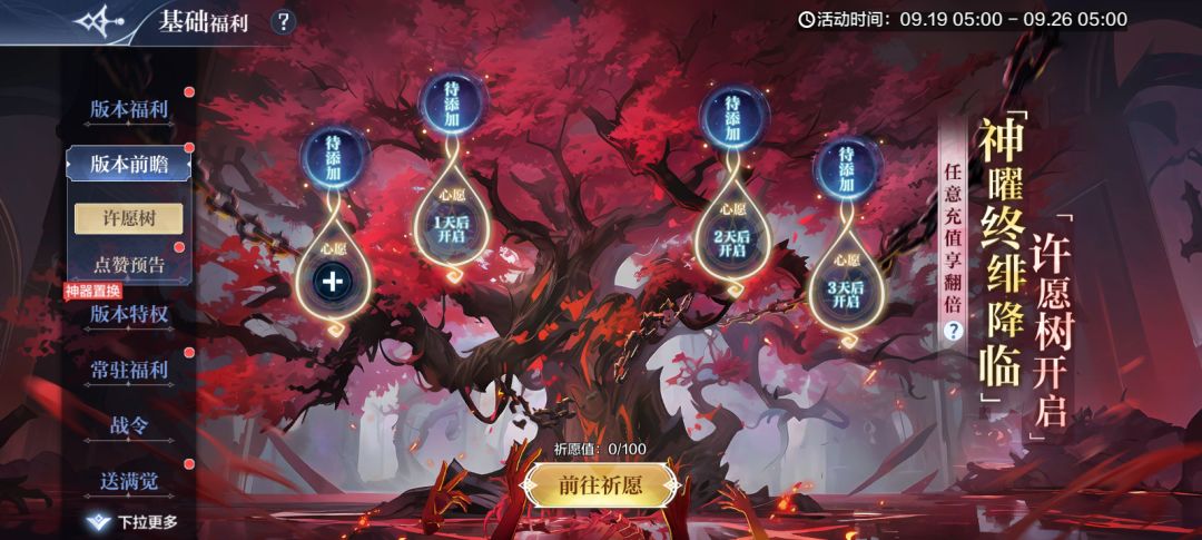 3、 每个许愿栏实现,需要消耗100点祈愿值,祈愿值通过每日的活跃度任务增加;