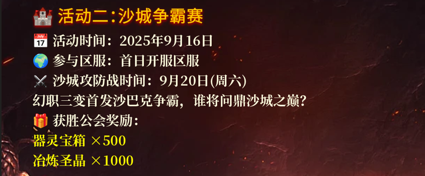- 活动时间:2025 年 9 月 16 日开启报名,9 月 20 日(周六)正式打响沙城攻防战
