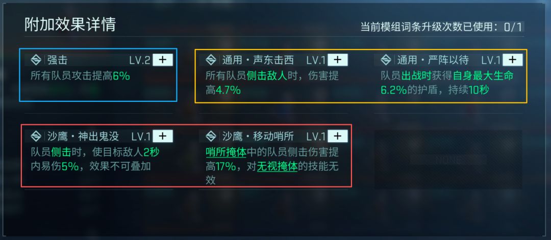 🟡 通用词条(黄框):带「通用・」前缀,所有模组都能出,比如「通用·声东击西」,所有队员侧击敌人时,伤害会有所提高
