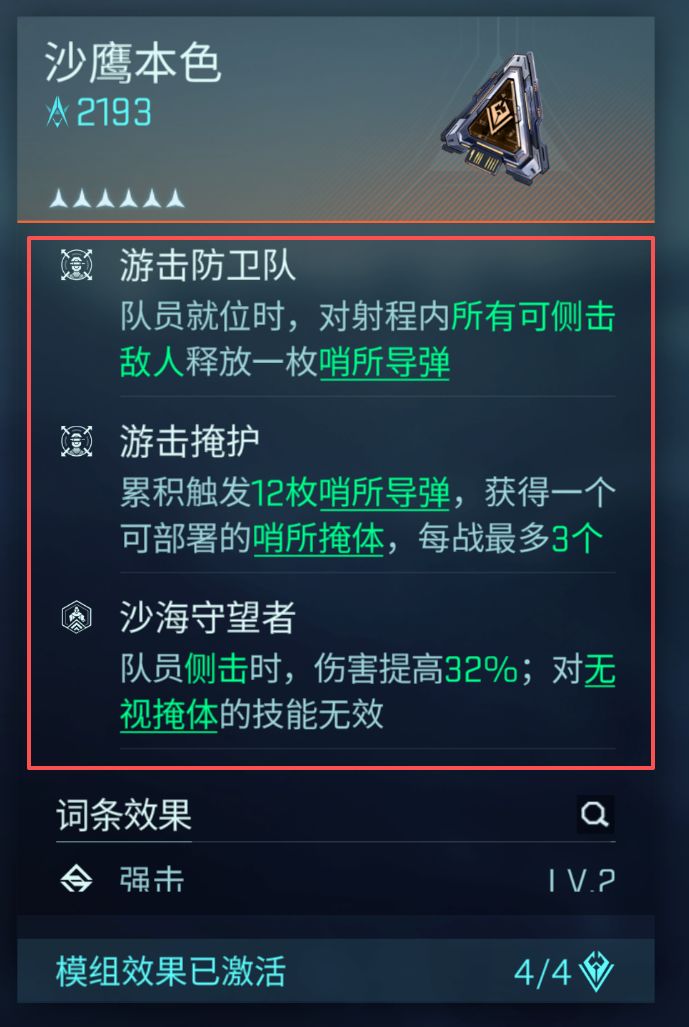 所有品阶的【沙鹰本色】模组都有这三个基础效果,分别是「游击防卫队」、「游击掩护」、「沙海守望者」