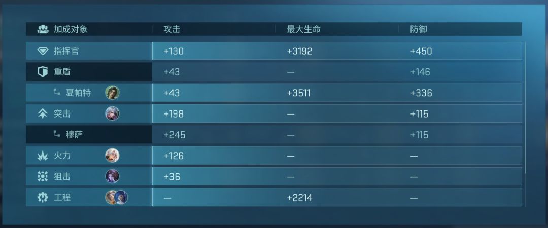 对于编队中的队员会有额外的基础属性加成,分别是攻击、最大生命、防御加成