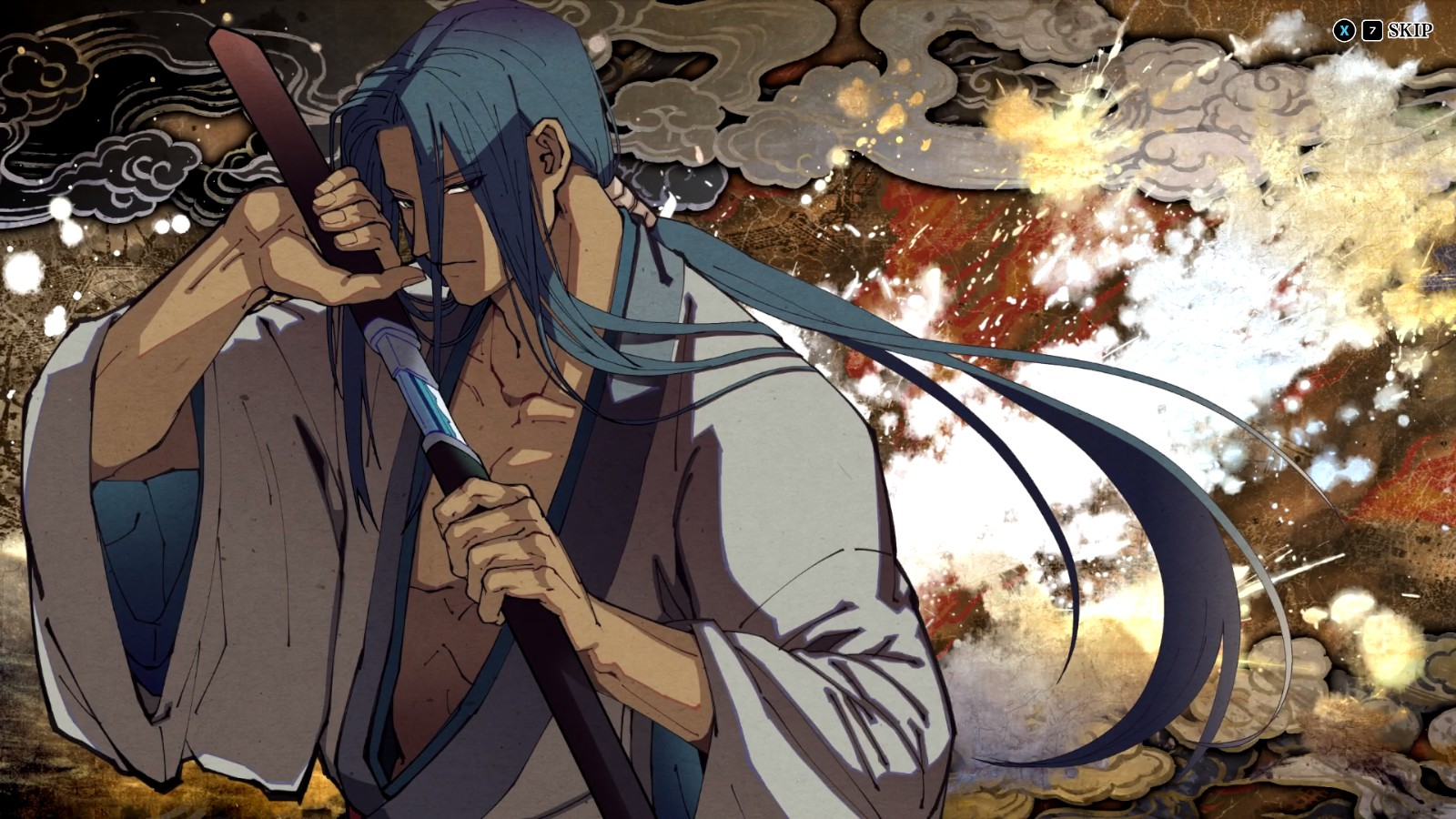 画面方面吧,在那个年代的技术力以及流行趋势,让这款游戏拥有了非常浓重的日式水墨风格。此外当角色进行大招输出的时候的动画还是非常的炫酷。角色的胜利结算动画也是非常的多样,有些还非常有特色,例如橘右京的一个胜利结算动画是被一群女性歌姬追着。如果玩家想要更加直观全面的欣赏游戏的美术,则可以在主界面的会草纸选项中欣赏已经解锁的动画、插画图以及好听的BGM。