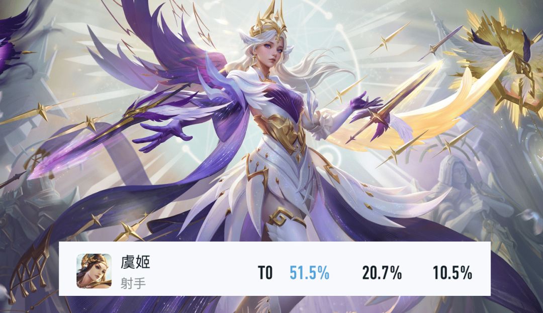 虞姬在射手里面的胜率虽然不是第一,但51.5%的胜率,20.7%的登场率,10.5%的Ban率,综合数据是射手一姐。虞姬的强势点很清晰,2技能可以免疫物理伤害,这就让她成为了射手里面保命能力最强的英雄之一,像其他射手害怕的韩信、李白、孙悟空、兰陵王等突进英雄,虞姬可以很好的反制他们,只要在他们突脸的时候开启2技能,接大招拉开距离,或者反过来,先用大招拉开距离,在他们第二次突脸时再开启2技能,然后一顿平A大概率就可以将其反杀。