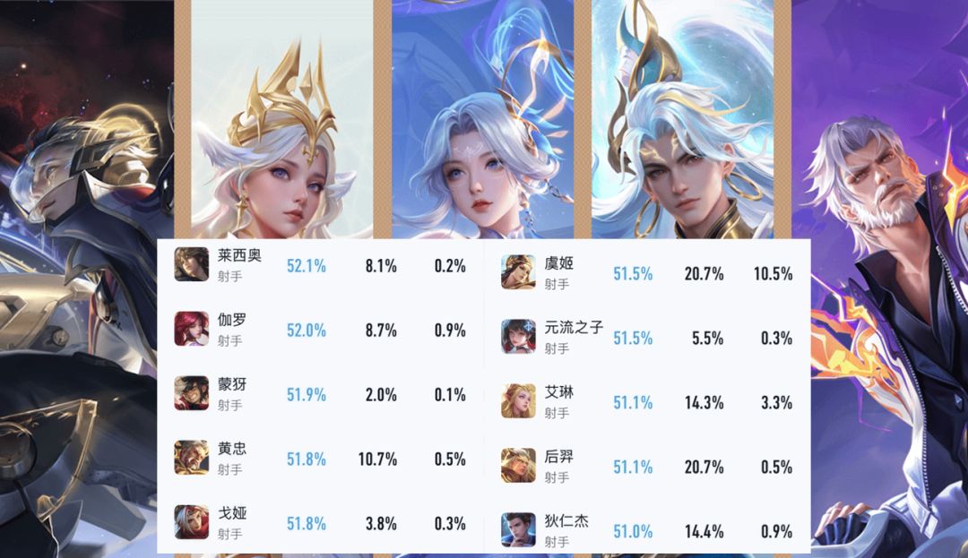 在这样的情况下,射手环境确实要比前几个版本好一些,虽然没有那种53%以上的超高胜率射手,但51%以上的一大堆,比如莱西奥、伽罗、蒙犽、黄忠、戈娅、虞姬、元射、艾琳、后羿、狄仁杰。