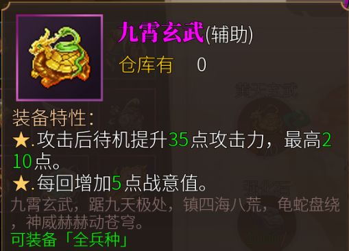 张角那里兑换的辅助,注意看蓝乌龟和紫乌龟的文字描述的差别,蓝乌龟说的是“主动攻击后”,紫乌龟说的是“攻击后待机”,看起来似乎是不限攻击类型,反击和协助攻击也都可以?我当初就是这么想的,实测发现,关键点在于“待机”,具体机制如下