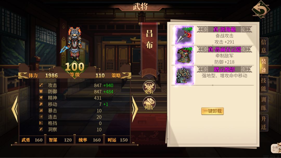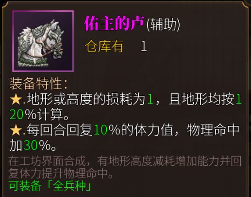 听说其他三国战棋游戏的地形辅助都很强,但的卢的120%地形因为不是独立乘区,会被稀释得比较严重,推荐不要给能用涯角枪或青龙刀的角色用,可以给一些没有增伤的角色用。另外在负面地形上(比如90地形)用的效果还是挺不错的