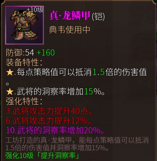 乍一看这文字描述感觉平平无奇,典韦100点蓝,能挡150点伤害,敌方随便一下都500+的伤害。但实际上是只要有蓝就能挡一次伤害,而且每回合能回1点蓝,相当于每回合挡一次伤害。此外这个效果只能用来挡物理伤害,挡不了法术伤害。此外不要太期待这15%+30%(红词条)的洞察率,对面的法师都有自带命中效果的,实际上很难回避掉对面的策略攻击