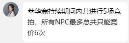 如上图所示,客服所说的5场竞拍,所以NPC最多总共只能竞价6次。非常的…额 ,,,这个,,,那个,,,今天天气不错!!!对,天气不错,真好!