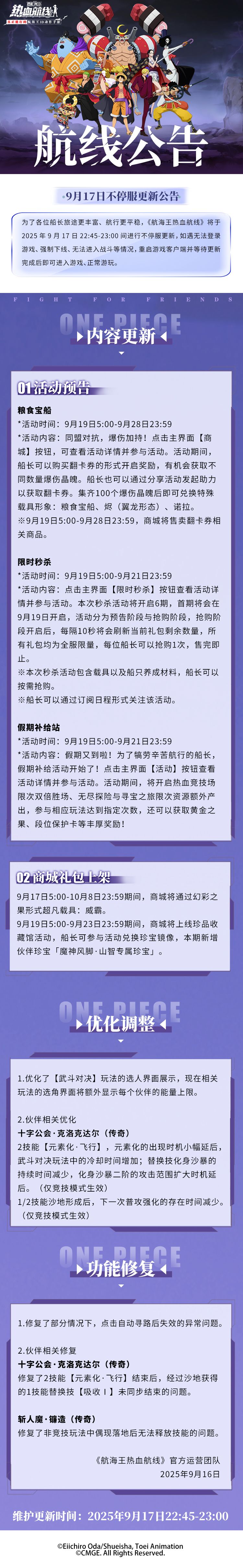 为了各位船长旅途更丰富、航行更平稳,《航海王热血航线》将于2025年9月17日22:45-23:00间进行不停服更新,如遇无法登录游戏、强制下线、无法进入战斗等情况,重启游戏客户端并等待更新完成后即可进入游戏、正常游玩。
