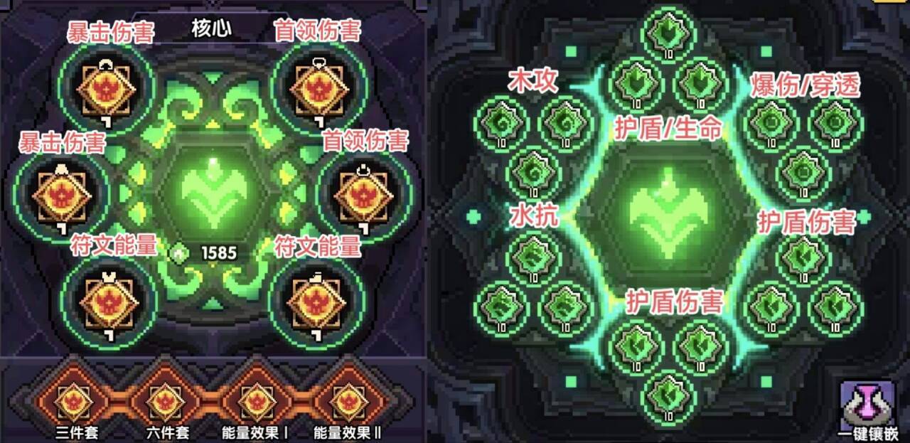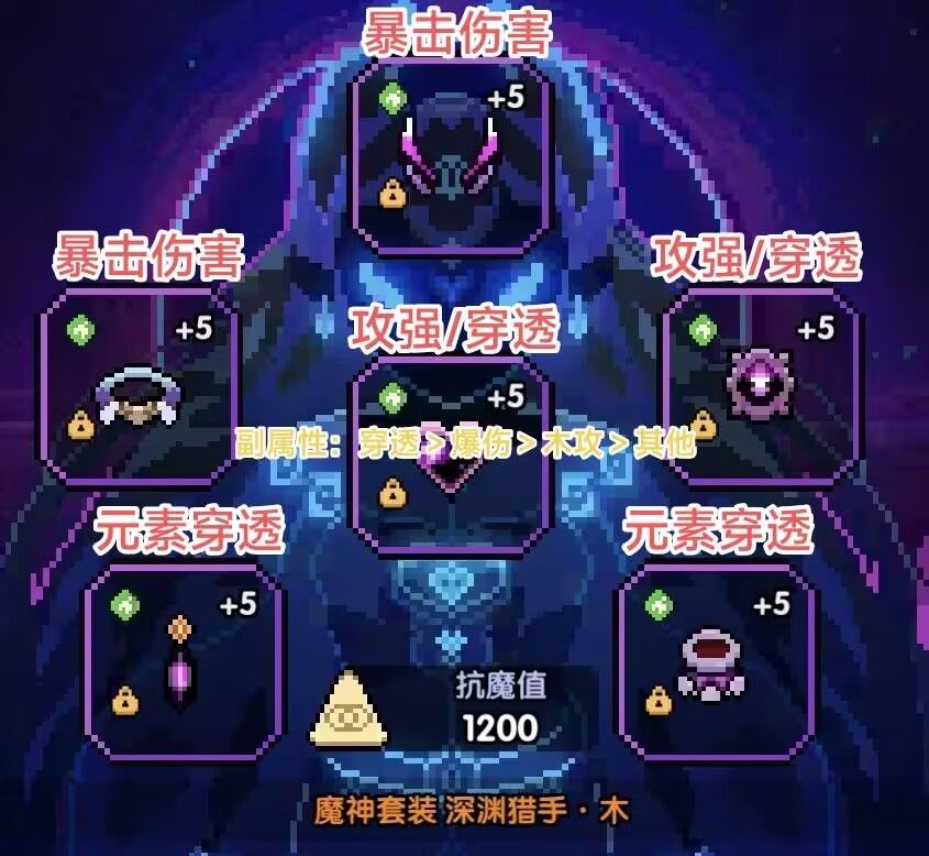 副属性:9元穿,7木攻2爆伤/6木攻3爆伤,木攻可以适当洗多一点,不过还是哪个更接近最高值用哪个