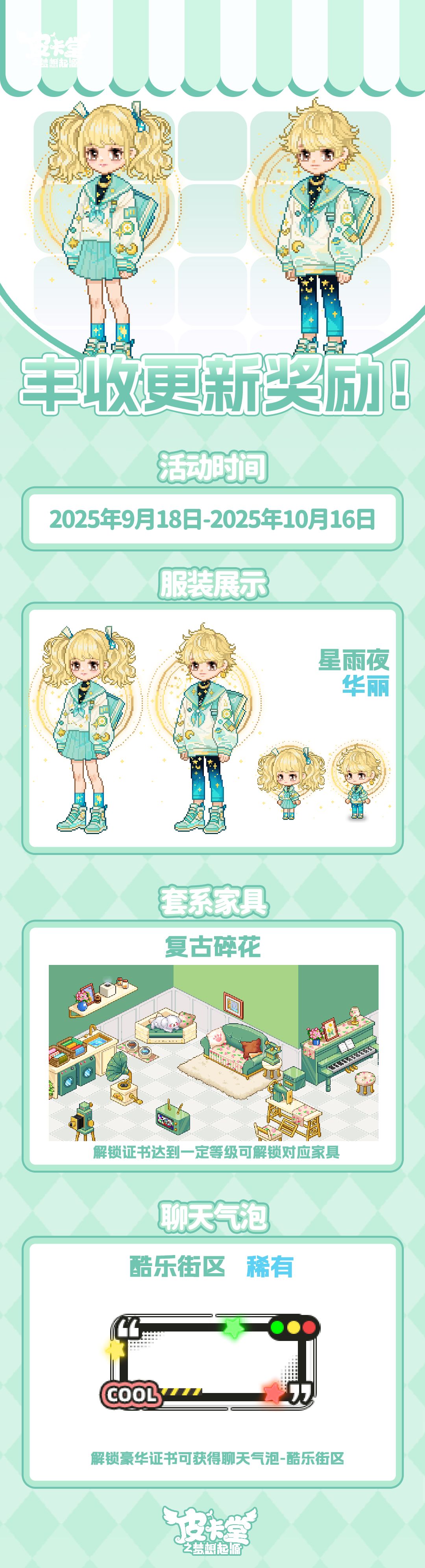 -【丰收通行证】更新上线,解锁丰收高级证书可获得证书积分,可兑换当期丰收的限定家具「复古碎花」、购买通行证并完成对应任务可获得华丽套装「星雨夜」,加购高级通行证可获得本期丰收活动限定聊天气泡「酷乐街区」。