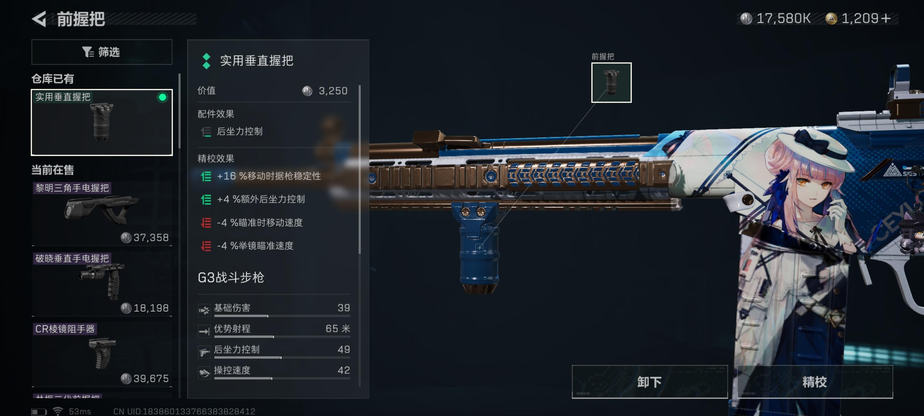 前握把就选择经济实惠,好用不贵的——实用垂直握把。只有后坐力控制,没有任何负面属性!以小博大,对面见了都要摇头的配件。