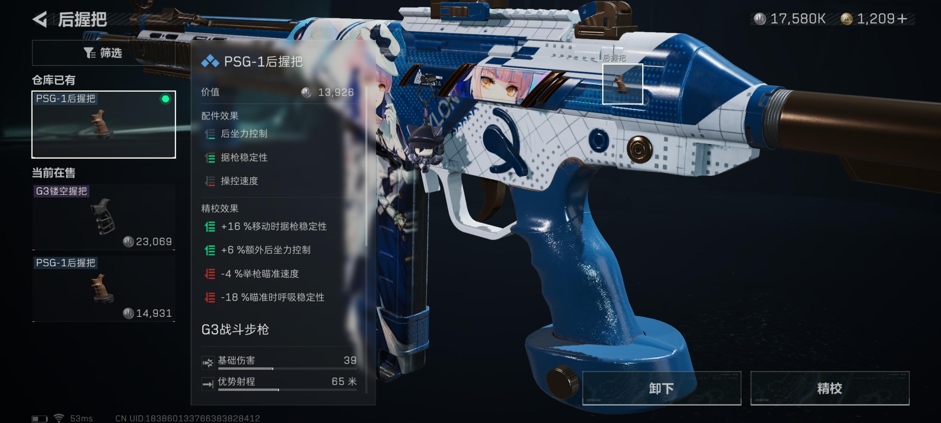 当然拥有了前握把,后握把怎么能缺。后握把就选择——psg—1后握把,虽然减少了一定的操控速度,但是可观的据枪稳定性还是非常实用的。