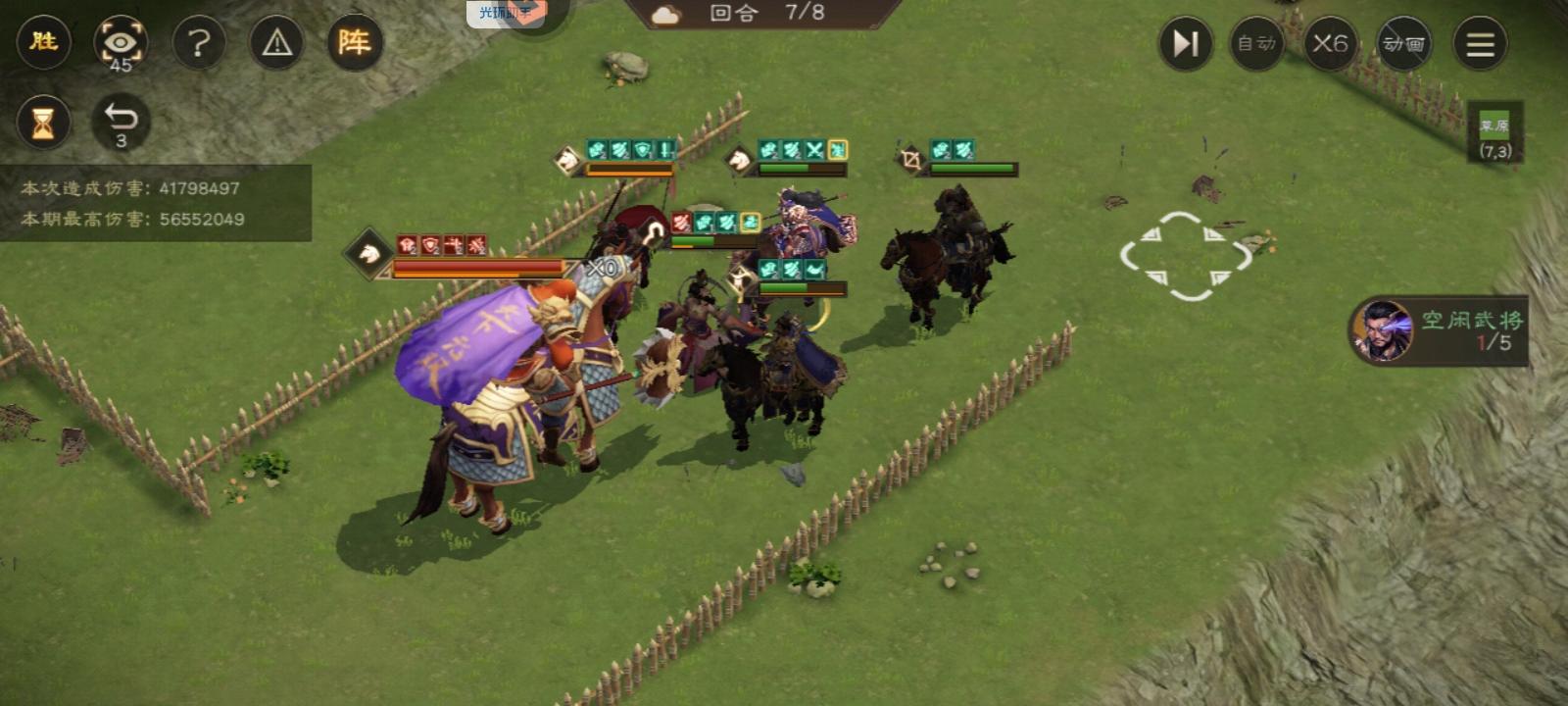 7.6回合:曹操普攻,夏侯惇普攻,607输出,貂蝉再动夏侯惇,顺便清debuff,夏侯惇开大,夏侯渊输出。结束站位如图。