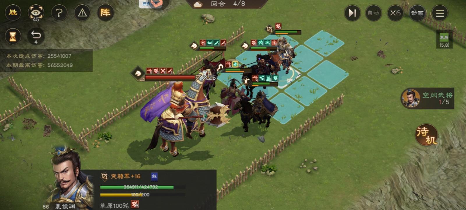5.4回合:曹操移动到图示位置,开1技能清除夏侯惇貂蝉身上debuff,貂蝉普攻,夏侯惇普攻,607普攻,夏侯渊移动到图示位置输出。注意续上爆伤/兵刃debuff,结束站位如图。