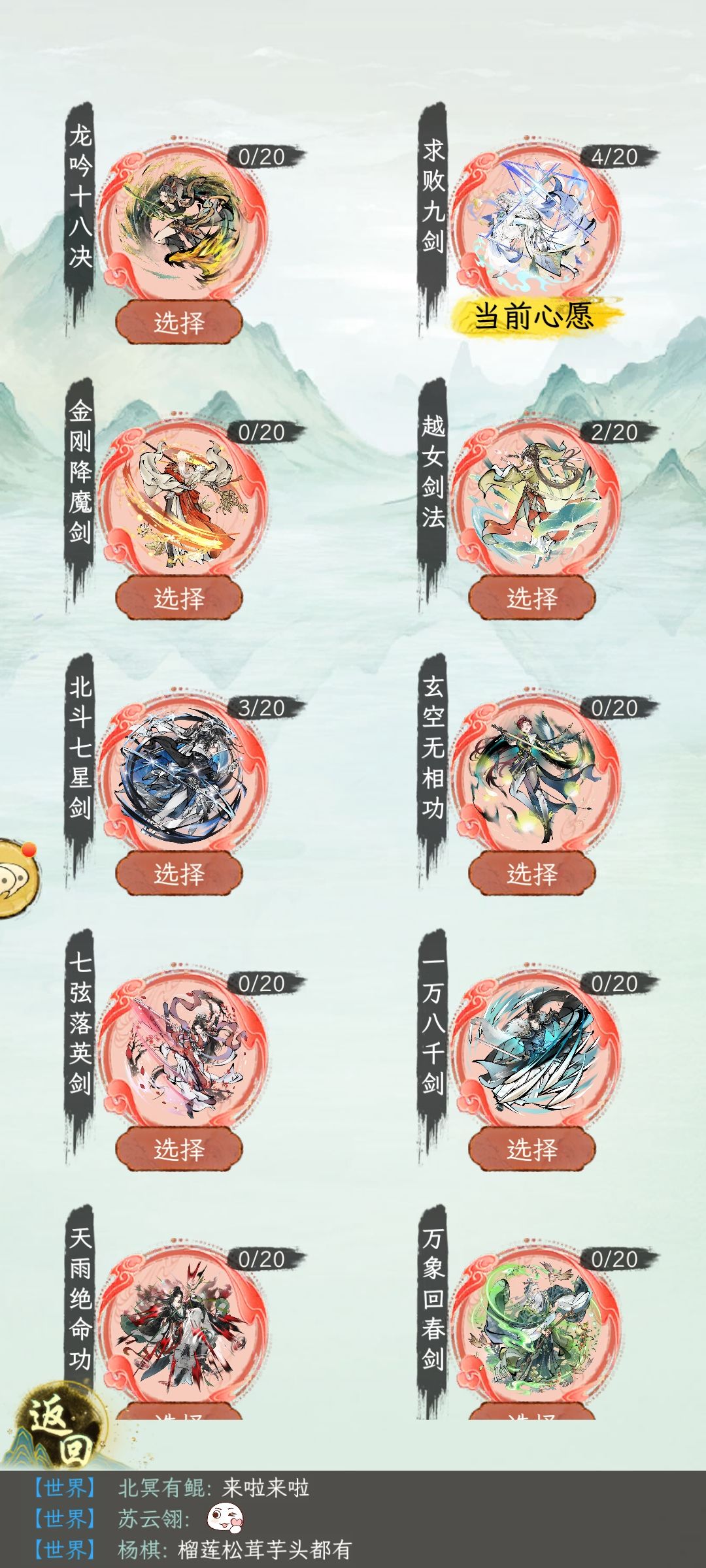 开始五个绝分别会是五个进攻位,可以灵活变通,随后随机出。接下来就选自己外功多的武学,因为第一遍出不会重复,抽满后锁心愿才能抽重复,关键内功可以兑换和请教。