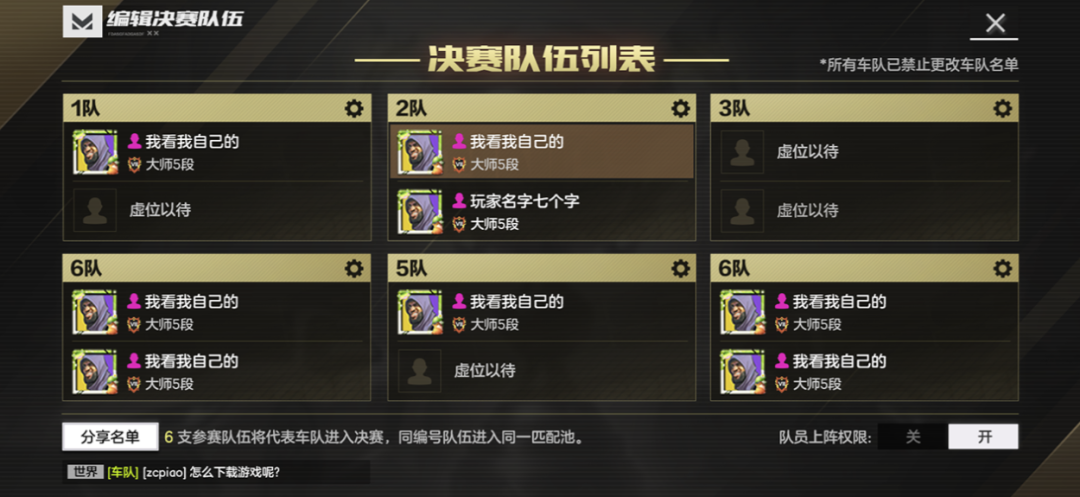 当决赛准备期截止后,阵容名单将被锁定。若队伍中存在空位,系统将自动按照段位分从高到低自动补足成员,确保每支队伍都是满编出战。