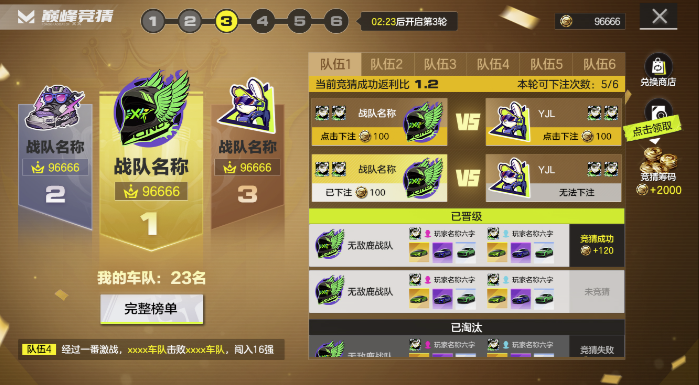 在决赛期间的每轮比赛中,赛车手们均可对当前轮次尚未结算的任意车队小队进行竞猜。竞猜成功即可赢取更多“竞猜币”,不同轮次的返利比例可能有所不同。所获竞猜币还可在车队商店中兑换各种奖励!