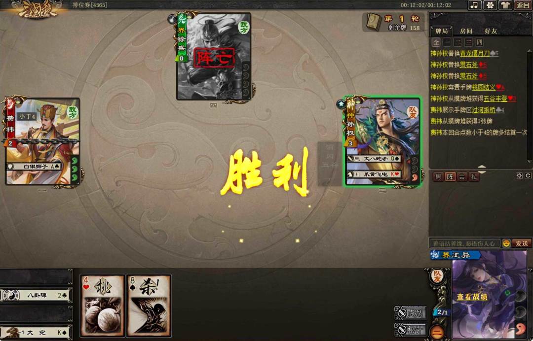 案例1:存活人数多的一方获胜(2V1)。本局结算时神孙权、界王异均为1血,费祎3血,界徐盛阵亡。最终神孙权、界王异获胜。