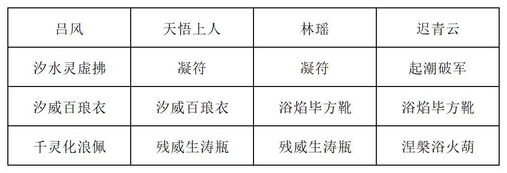 第一回合:吃法力丹,天悟上人打出三清化水符、五行化水咒,吕风复制三清化水符并全部打出,迟青云打出五行化水咒和衍水决,天悟上人打出断水龙威,林瑶打出燎原决,涅槃咒和战意决,迟青云打出轮回断水击。