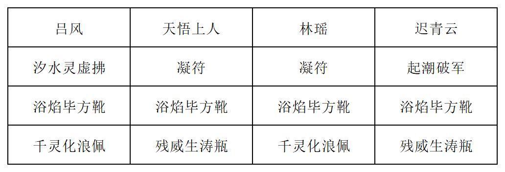 第一、二回合:吃法力丹,天悟上人打出三清化水符、五行化水咒,吕风复制三清化水符并全部打出,迟青云打出五行化水咒和衍水决,天悟上人打出断水龙威,林瑶打出燎原决,涅槃咒和战意决。如果有火灵气可以将林瑶的出牌顺序提前让战意决吃到火灵气的加成。迟青云打出轮回断水击。