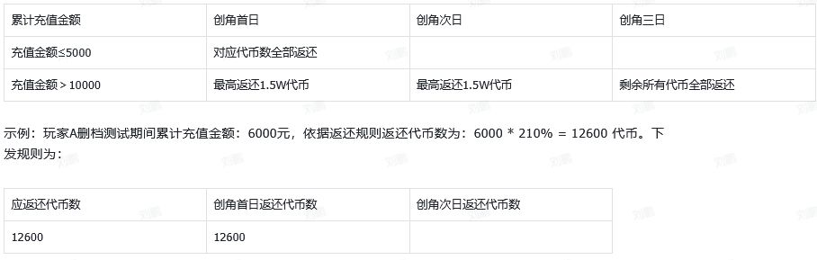 示例:玩家A删档测试期间累计充值金额:6000元,返还代币数为:6000 * 210% = 12600 代币。代币在游戏内使用时1:1抵扣充值人民币。