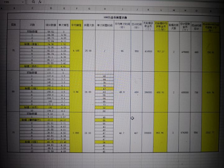 1、100万金币刷取次数(均向上取整):70层需要26次,75层需要25次,80层需要26次。