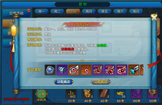 - 大乱斗竞技:每周一、周三、周五 20:00-21:00 开放,20 级及以上玩家可参与。战场内击败其他玩家或首领可获 “功勋值”,5 分钟无操作将自动退出场景;功勋值可在 “功勋商店” 兑换时装、传说装备等稀有道具,竞技与奖励兼得,休闲之余也能提升战力。