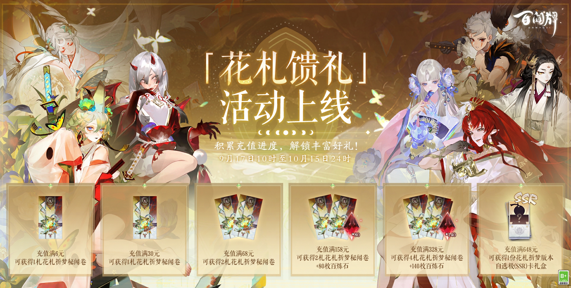 9月17日10时至10月15日24时,客人们充值所获得的魂玉可以累积进度,达到一定进度后,即可获得「花札祈梦秘闻卷」、百炼石、《花札祈梦》版本自选极(SSR)卡礼盒奖励~