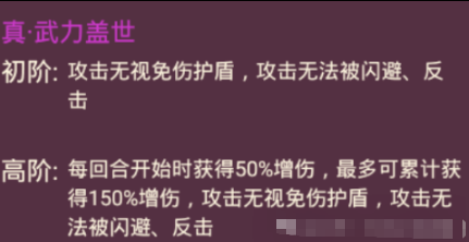 【雄壮·颜良】需要进阶两次,由【勇将·颜良】开始进阶,该武将是跨消10W档次的武将,三围相比上阶增加了60,每回合增加50%的增伤,最高可以叠到150%,另外虽然只攻击1次,单次可以无视免伤护盾。