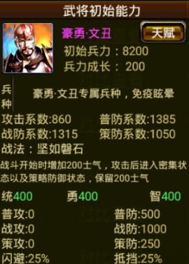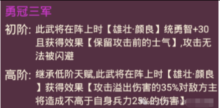 【豪勇·文丑】需要进阶两次,由【夫勇·文丑】开始进阶,该武将是跨消15W档次的武将,上阵豪勇·文丑可以让雄壮·颜良的三围+30,且让颜良保留攻击前的士气。