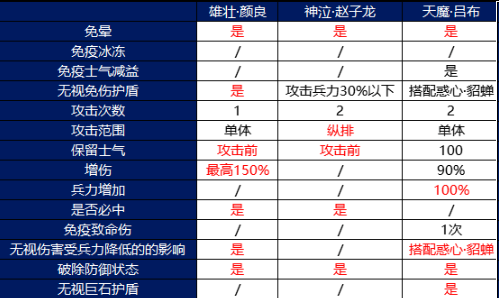 另外神泣·赵子龙系数高于颜良,但是没有增伤,不过攻击兵力30%以下时可以无视免伤护盾和一血效果,这也算是赵子龙的特点,另外赵子龙如果兵力降低的话是会影响到自己的伤害的。