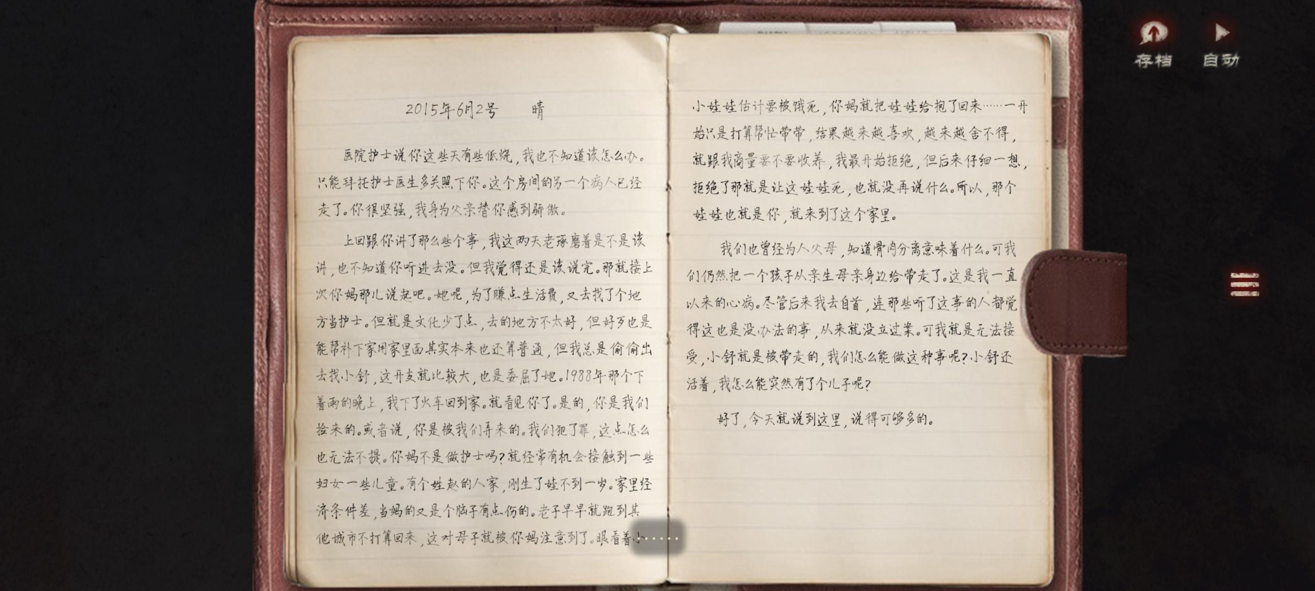 陆陆续续的隔了很久才玩完,刚开始一直没玩明白到底是什么意思,最后几个章节内容一下子很清晰明了了,是关于拐卖儿童的事件,最可恨的就是吴东海,其次就是那些帮凶,可惜吴东海判的太轻了,希望世间不再有人贩子,希望家人都能团聚,希望每个小朋友都能跟爸妈快乐幸福的生活在一起