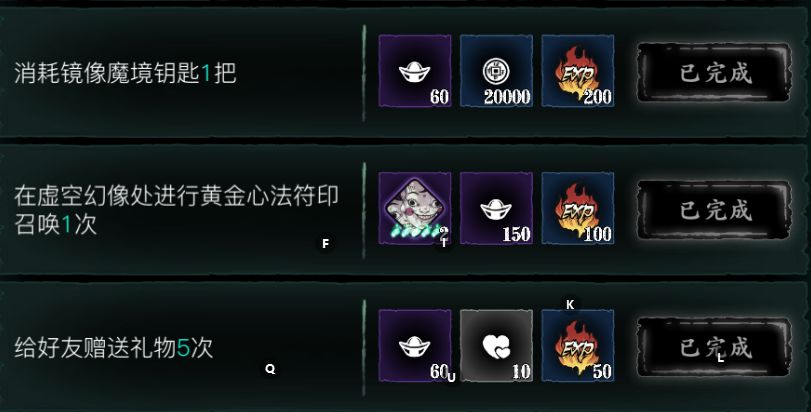 赛季每日任务里面消耗200体力可以打限时体力副本来完成(笔者写时是“黜佞证道”(每两周更替一次)),每日十次斩厄副本也可以打一打,累计消耗200元宝可以在虚空那买一个厕纸(黄票)和魔像钥匙来完成,论剑打不打就看你自己了。