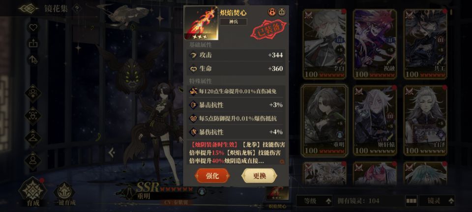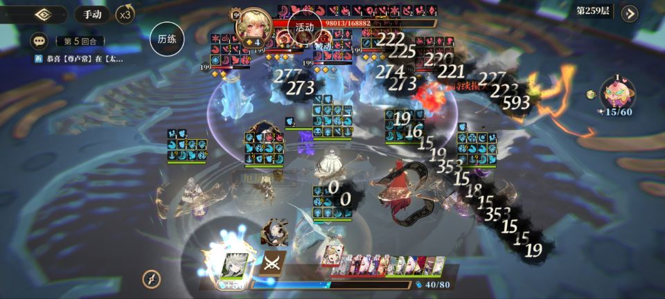 爬通了260,鉴于是不氪金玩家,没有新角色,更没有那么多资源,可以把全队都练满四级。更何况在这个新出的几层数值夸张的本里面,你需要有足够多的保护角色,才能撑得住自己的输出生存。带一堆老角色,就算练满了四级,恐怕也很难撑得住。如果你没有蚩尤,没有句芒这些先机免伤角色的话。那么,恐怕我们只能另辟蹊径来提高生存的能力,只能多多使用渺音。没错,在这个抵抗也被提高了的本里面,我们得靠这种依赖命中的玩意儿来保证自己的生存。但同时,万一没中降攻击和降暴击只是降防御的话,也完全没有对自己的生存提供什么帮助,所以尽量选择几个高命中角色,多带几个渺音,速度大于输出。不至于让输出被直接弹死。优选白泽太子,白泽自己还有三技能的免伤,可以帮助你多活一段时间。258只要做到撑住三回合控住宵明别让她放出结界,后续生存压力就会小很多。至于259最大的难点是凤凰,建议共工直接穿了它,但是那也很难。旁边还有一个神武祝融在那。大部分人很难活到能够直接给他穿掉三条命的阶段。而且多段输出会被挂灼烧,还会被反弹直伤,于是乎,我想到了一位仓管角色重明。