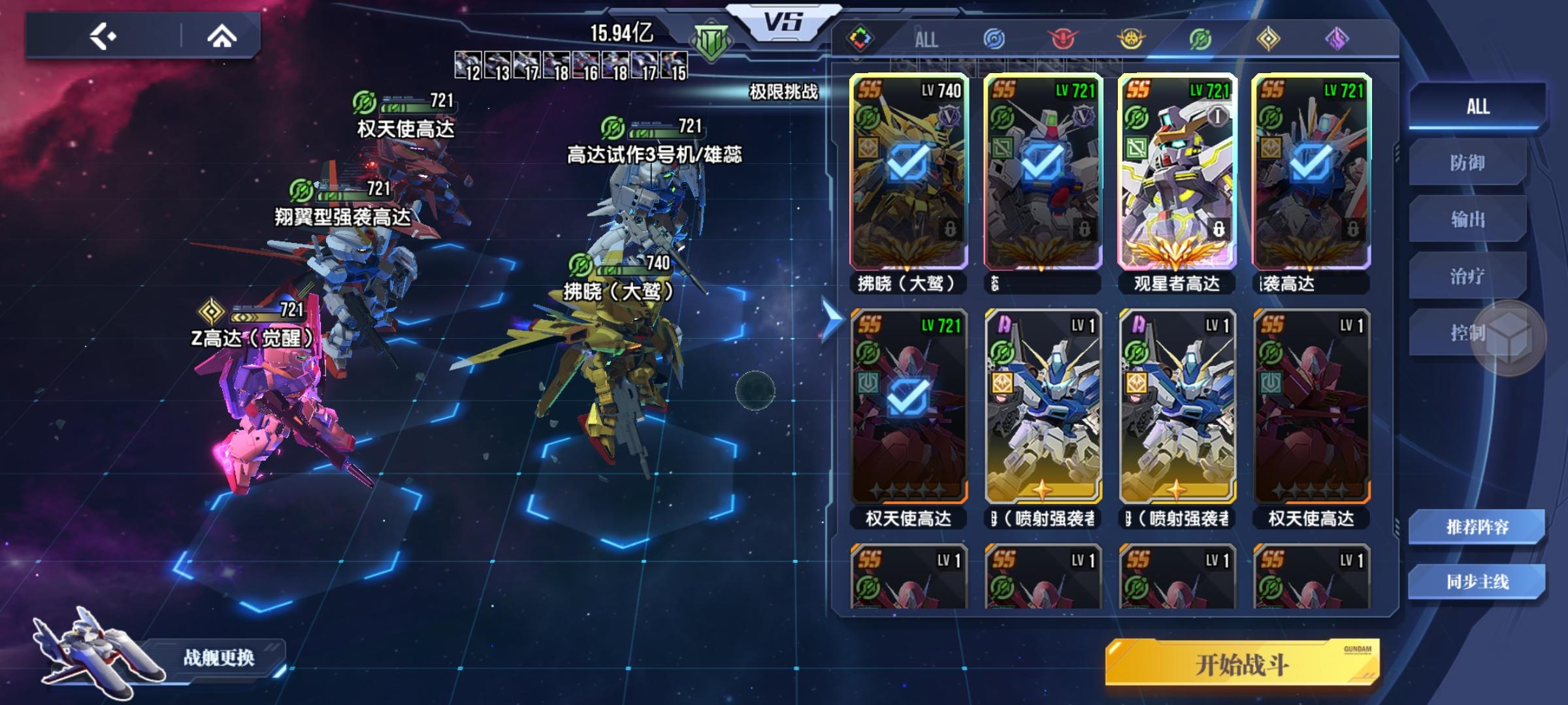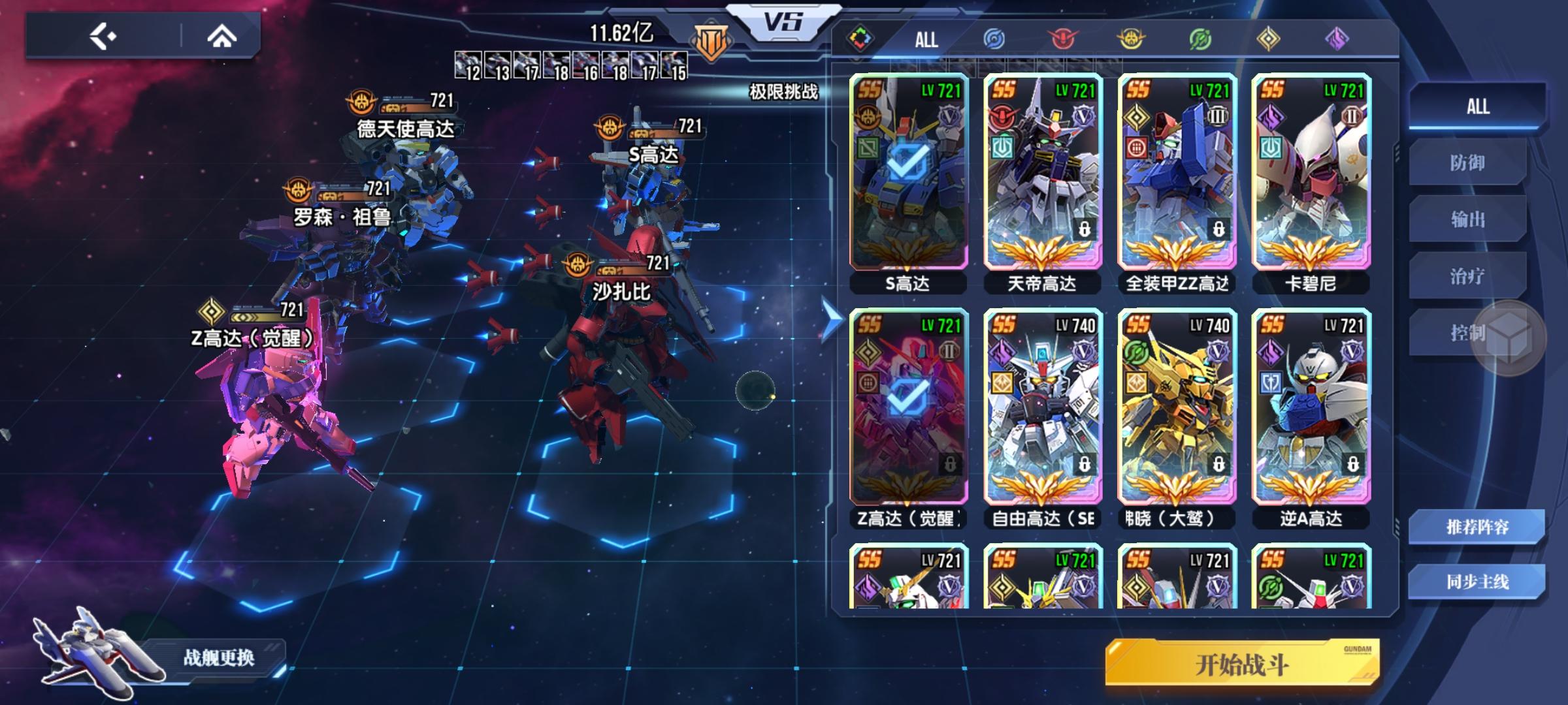 一般情况下极限挑战的boss是吃控制的,而且被控了,还能触发Z高达(觉醒)的大招追伤,所以上个控制凹伤害也是很有必要的。目前控制首选半周年庆的超级高达,其次可选逆X或者拂晓(大鹫)吧,实战效果需要测试看看,超级高达和逆X控制率高,拂晓(大鹫)控制多1秒,且带有爆伤加成,但是控制率低。可以这两个都用用看看哪个凹伤害高。