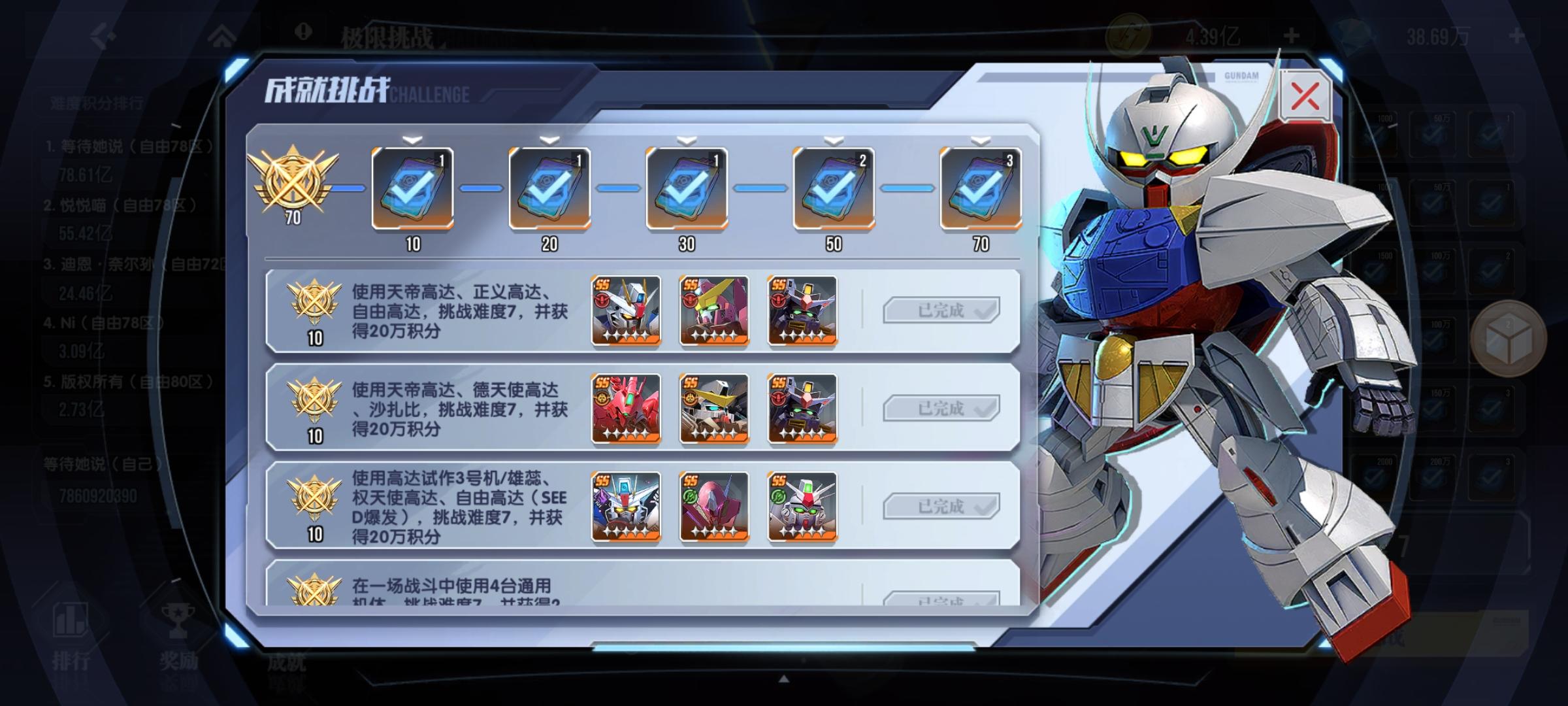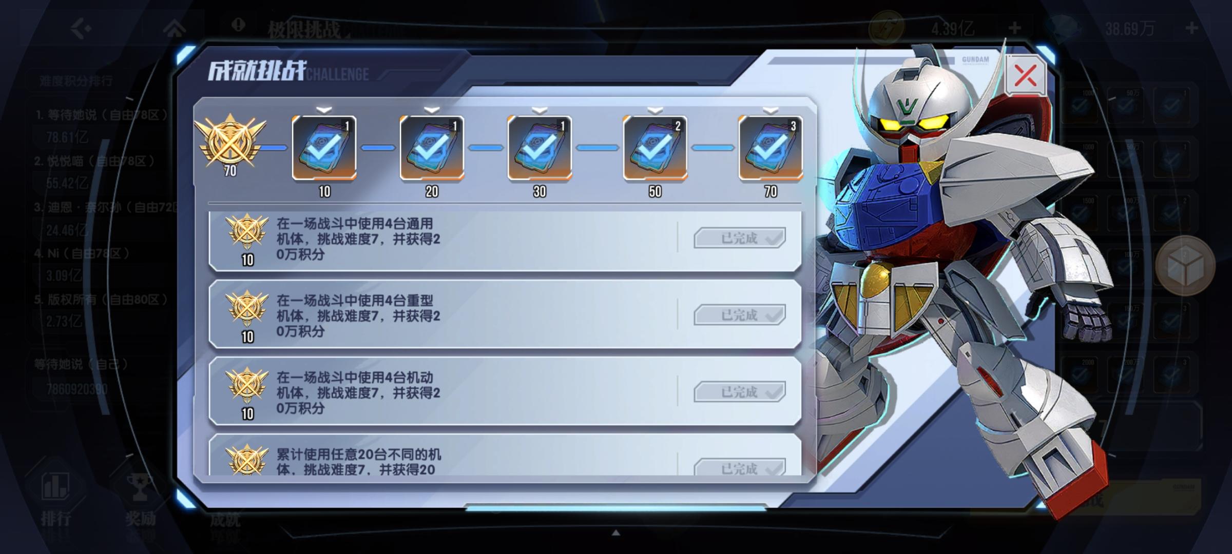 成就挑战前三个需要上特定机体完成的挑战,我们除了必须要求出战的三个机体外,剩下两个位置可以选Z高达(觉醒)、超级高达。这两位配合造成的伤害,足以完成积分要求。