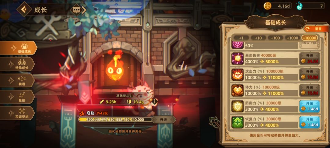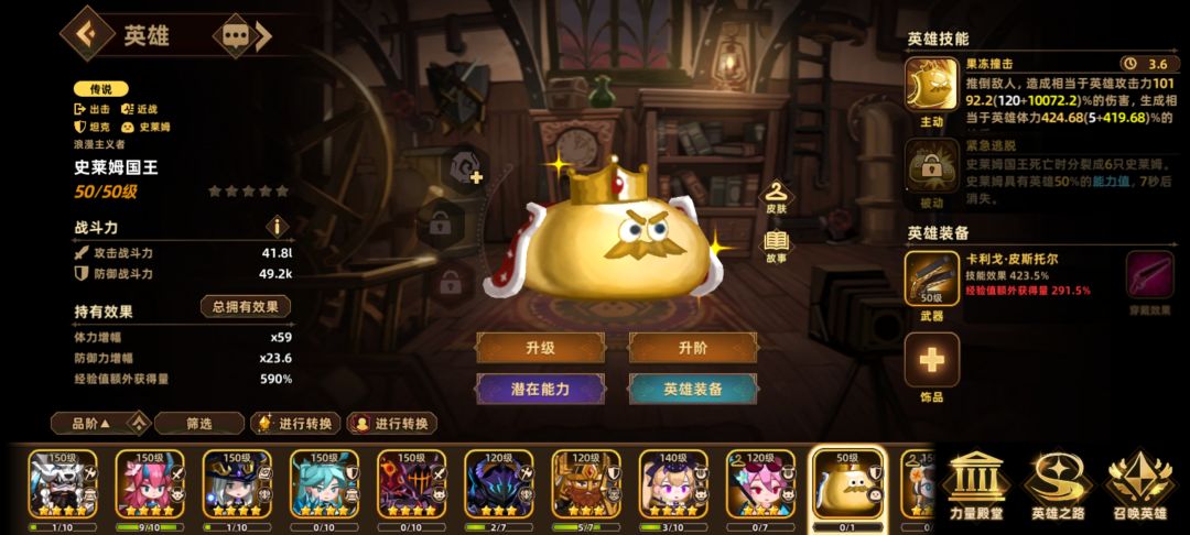 4钻石的用法,旅行商人的打折卷,抽限定角色拿奖励,基本一轮零氪,奖励抽到5颗星星的奖励就停了,等到金色英雄基本全5星以后,中期买一下旅行商人里的各种史莱姆,2星即可,后期钻石买史莱姆女王,国王,高培养女王,国王,史莱姆的作用是有一个持有增幅,在图片左下,史莱姆国王有一个较高的体力增幅