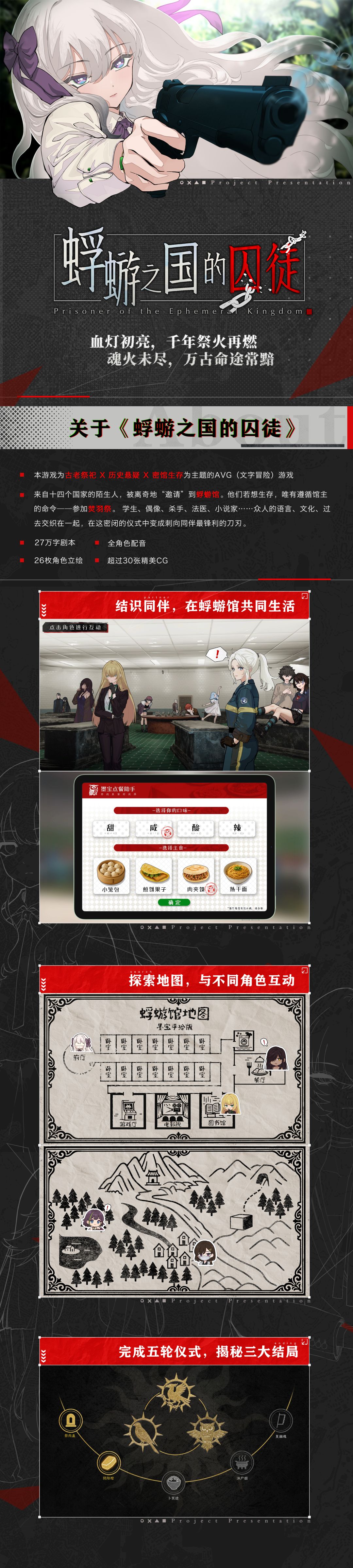 《蜉蝣之国的囚徒》是一款由迩来工作室与风域游戏联合制作的融合古老祭祀、历史悬疑、密馆生存元素的沉浸式AVG。