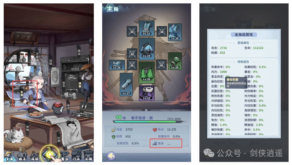 3.属性名词介绍少侠点击主角-主角-更多就能看到属性面板了,点击属性名字,就能看到该属性的具体介绍了